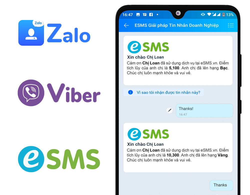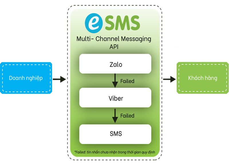 ESMS cung cấp giải pháp Mutil-Channel qua API giúp doanh nghiệp có thể nhắn tin tương tác đa kênh với khách hàng qua Zalo -> Viber -> SMS đảm bảo gần như 100% tương tác với khách hàng